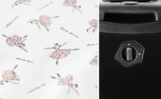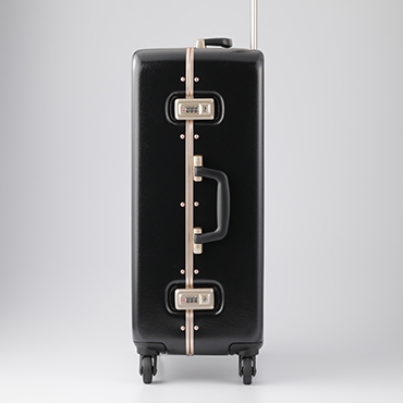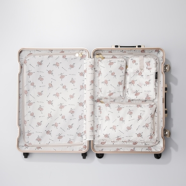 3~5泊程度の旅行におすすめのスーツケース。ついつい荷物が多くなりがちな女子にうれしいサイズです。内装仕切りの片面には、小物がたっぷり入るマチ付きポケット、着脱ができるポーチを付けました。360度回転する滑らかな動きのキャスターには、電車等の車内で不意に動かないようにストッパーで固定することができます。さらに、内装生地はきれいでかわいい柄を採用。ウキウキした旅の気分がさらに盛り上がります。