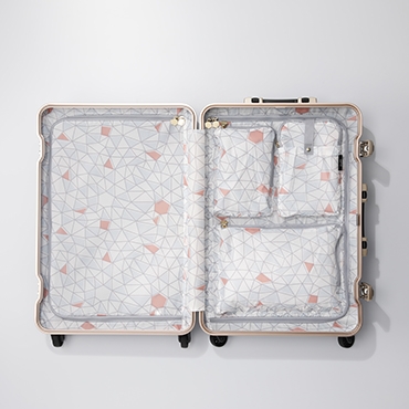 3~5泊程度の旅行におすすめのスーツケース。ついつい荷物が多くなりがちな女子にうれしいサイズです。内装仕切りの片面には、小物がたっぷり入るマチ付きポケット、着脱ができるポーチを付けました。360度回転する滑らかな動きのキャスターには、電車等の車内で不意に動かないようにストッパーで固定することができます。さらに、内装生地はきれいでかわいい柄を採用。ウキウキした旅の気分がさらに盛り上がります。