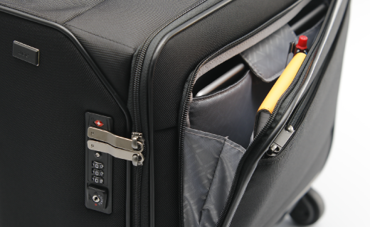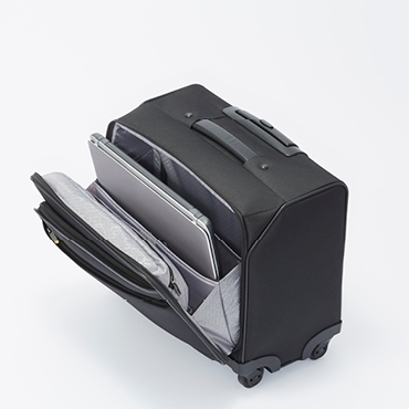 日帰りや1泊程度の出張、荷物の多い方の普段使いにおすすめの、横型ビジネストローリーです。メインファスナーを全開する手間を省いて荷物の出し入れが可能なフレックスルーフ™機能や、従来よりも大幅に体感音量を削減した独自開発のサイレントキャスター®を採用し、ビジネスシーンをスマートにサポートします。また、前側気室に15インチPC、フロントポケット部に10インチタブレット端末が収納可能。内装は、ビジネスツールと衣類などを分けて収納できる中仕切り付きです。国際線・国内線100席以上機内持ち込み可能。