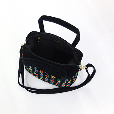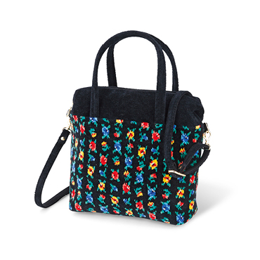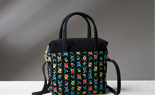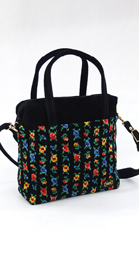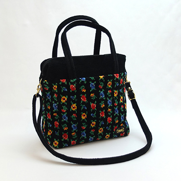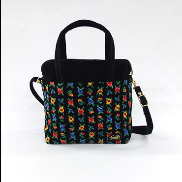 ショルダーが取り外しできるので、様々なシーンに合わせて使い分けが出来ます。背面にもオープンポケットを付け、見た目より容量が大きいので便利にお使いいただけます。切替部分(黒無地部分)から下に柄を入れて華やかなデザインにしました。