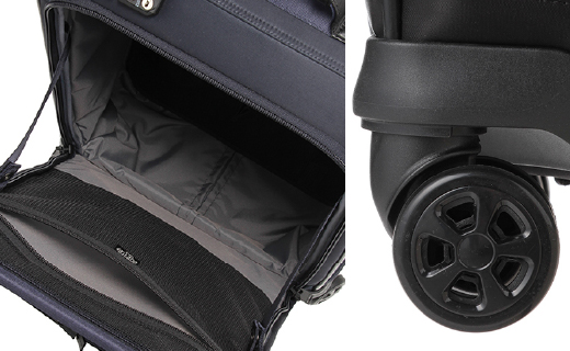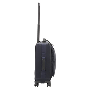 ビジネスシーンはもちろんカジュアルスタイルでも使いやすい、シンプルかつ機能的なトロリーケース。丈夫で引裂強度、摩擦強度に優れながらも軽量な生地を使用しています。キャスターは小回りの利く4輪タイプ。メイン収納を開閉するファスナーにはTSAロックを取り付けているので、安心してお使いいただけます。外装のポケットは出し入れの多いアイテムの収納に便利です。