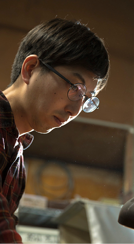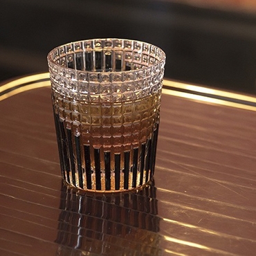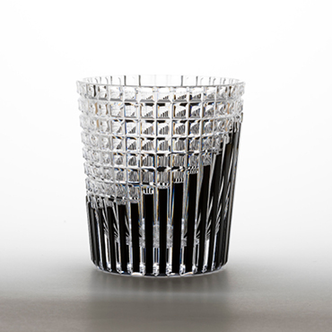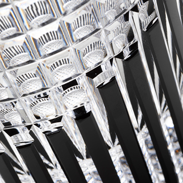 作品の魅力を最大限に引き出すうえで欠かせない「光」。本作は、江戸切子を通じて、その光の輪郭を捉えました。素材は上質な田島硝子製で、漆黒の素地に玉文様と格子文様が細やかに刻まれています。螺旋状になった漆黒の縦のラインは文字通り「光のステージ」のような役割を担い、きらきらと光る玉の文様が際立つ仕上がりにまとめました。