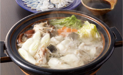 下関の調理師たちが1枚1枚丹念に盛り付けたお刺身と、ちり鍋用としてとらふぐちりをそれぞれご用意しました。とらふぐを二度お楽しみいただけるセットです。ちり鍋はポン酢との相性も抜群。ふぐのだし汁がしみ込んだお野菜と一緒にどうぞ。とらふぐの歯ごたえのある弾力と上品な旨味をご堪能ください。