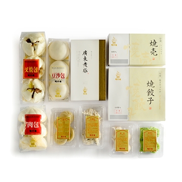 商品詳細/セット内容/肉まん・チャーシューまん・あんまん各3、シュウマイ8個、えび餃子・ひすい餃子・ふかひれ入餃子・小籠包各4個、焼餃子10個、廣東煮豚6枚、賞味期間/冷凍60日 ※配送先は日本国内住所限定となります。