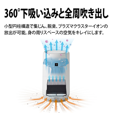 360°下吸込み。全周吹き出しで小空間のあらゆるところで空気を浄化。小型円柱構造を可能とし集塵と脱臭をひとつにまとめた一体型フィルターとなっております。全周吹き出し口よりプラズマクラスターイオンを放出。小空間や空気の汚れが気になる身の回りスペースの空気をキレイにします。