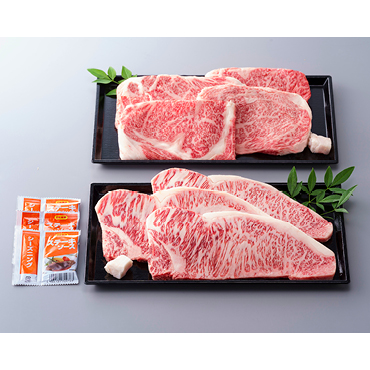 近江牛専門店の〈千成亭〉が選び抜いた未経産牝牛の近江牛を、ステーキ用とすき焼用でご用意しました。職人が一枚一枚手切りしたサーロインステーキは、肉の香りをお楽しみいただける一品。すき焼用は、柔らかな脂身とコクを、すき焼をはじめ様々なお料理でご堪能いただけます。