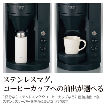 コーヒー豆の挽きからドリップまで、すべておまかせの全自動コーヒーメーカー。コーヒー豆は粉砕すると酸化が始まり、香りや風味が急速に失われていきます。本製品は『ミル一体型』で、豆を挽いた後すぐに抽出を行うのでコーヒー本来のおいしさが活きています。挽いた豆をマイコン予熱とダブル加熱の技術で高温抽出。さらに20秒蒸らすことで、コクと香りを引き出します。また、真空2重まほうびんのステンレスサーバーのためコーヒーが煮詰まらず、おいしさが長持ち。ステンレスマグやカップに直接抽出が可能です。
