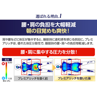 大ヒット低反発マットレス「トゥルースリーパー」の人気シリーズ!やさしくフィットするだけでなく、体全体を下からしっかり支える2層構造マットレス。従来品プレミアケアよりも、全身にかかる平均圧力を低減し、睡眠時の体全体への負担をさらに軽減!ワンランク上の寝心地を実現します。